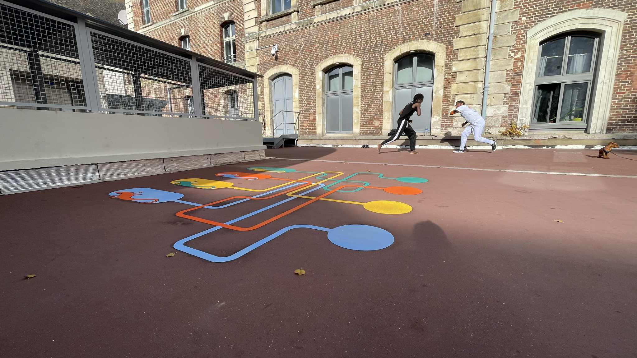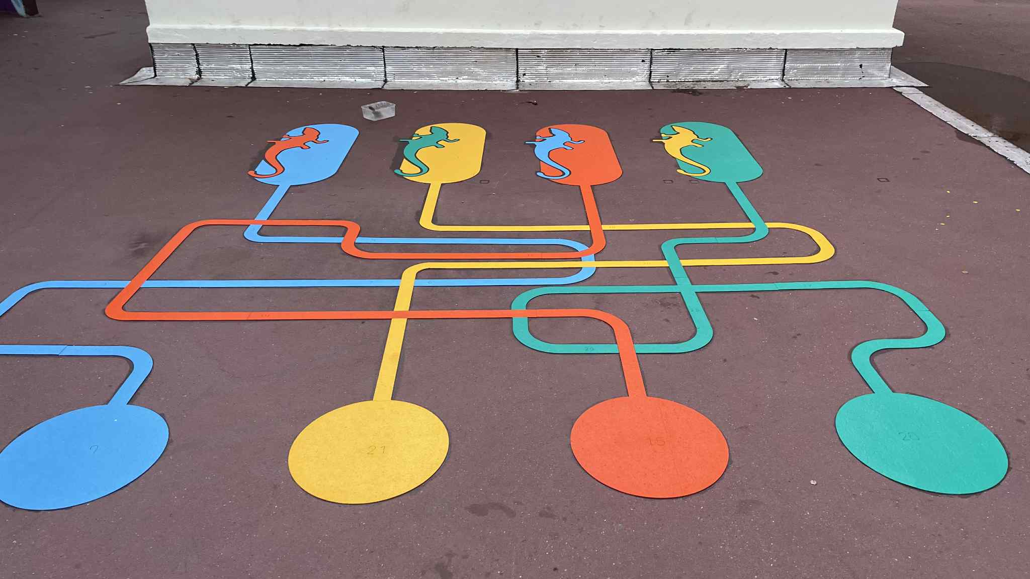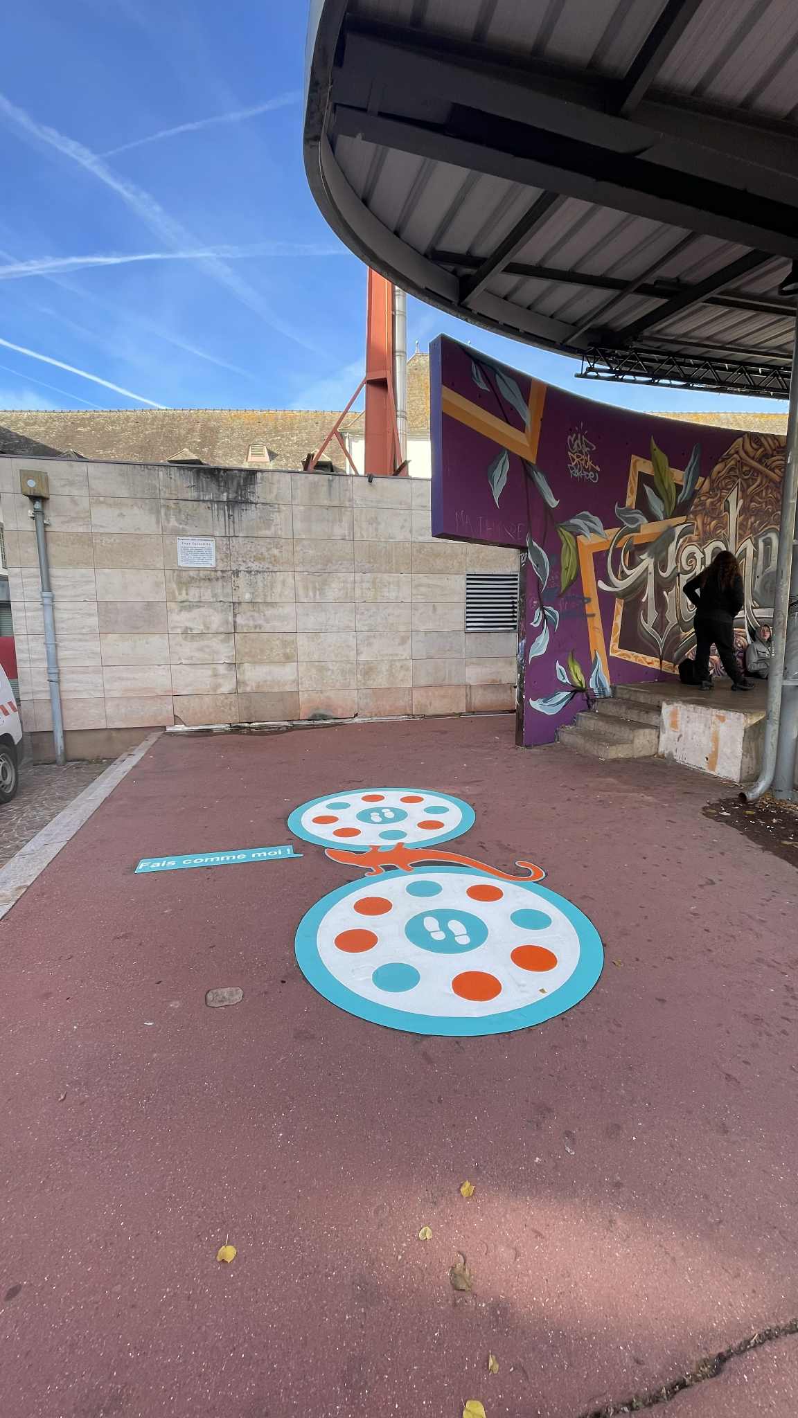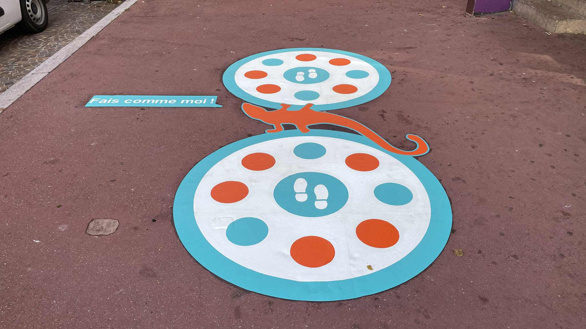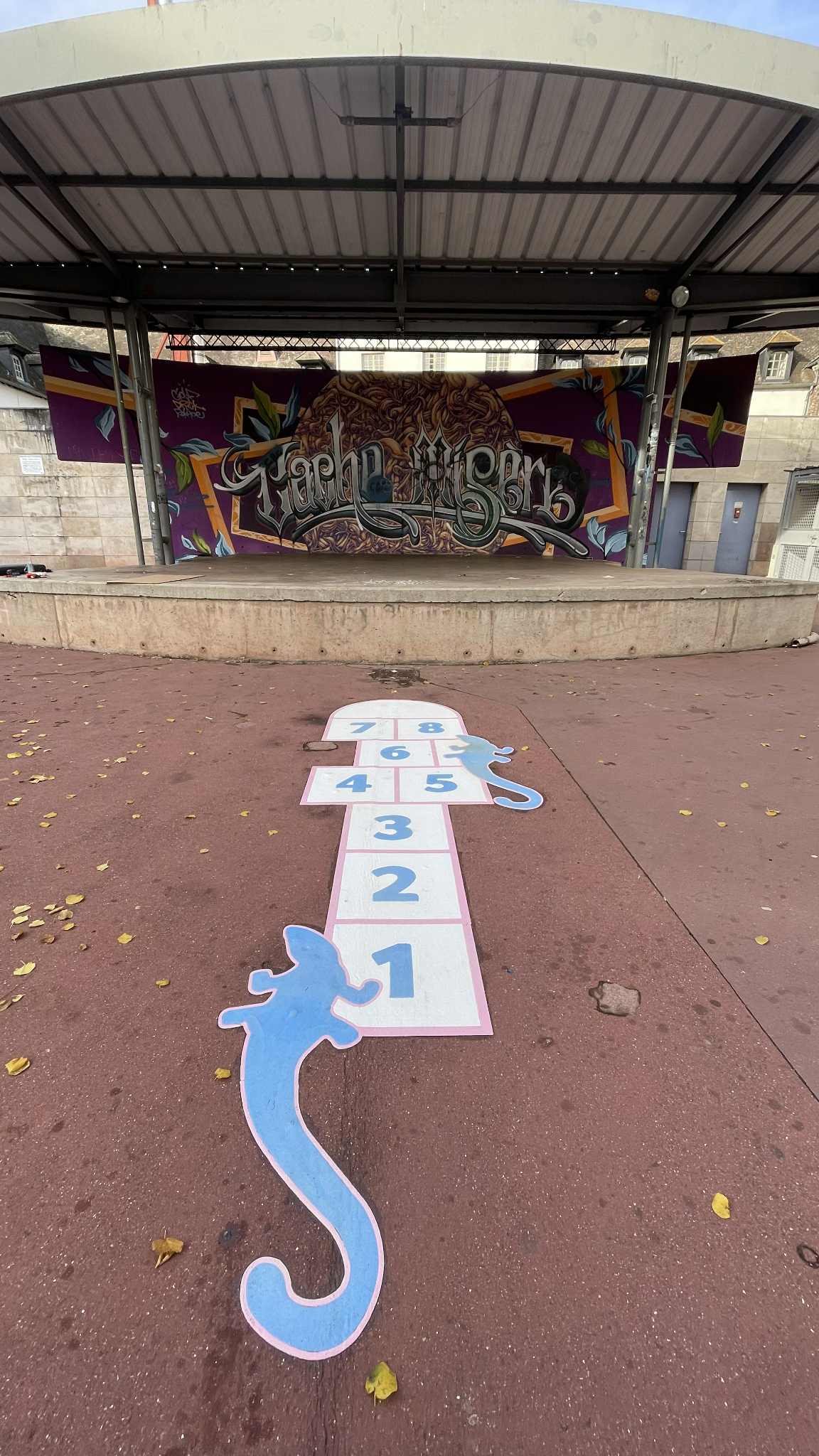 Mise en place de la phase 2 du projet de design actif de la Ville de Beauvais. Une réalisation en thermocollé de plusieurs éléments ludiques au sol ainsi qu’un parcours symbolisé par des salamandres multicolores au sein du centre ville. Un très beau projet ayant pour vocation de favoriser le sport et de mettre en valeur des éléments patrimoniaux ou architecturaux. #designactif #nudge #beauvais #cleantag #communication #thermocollant #streetart #sport #marquageausol